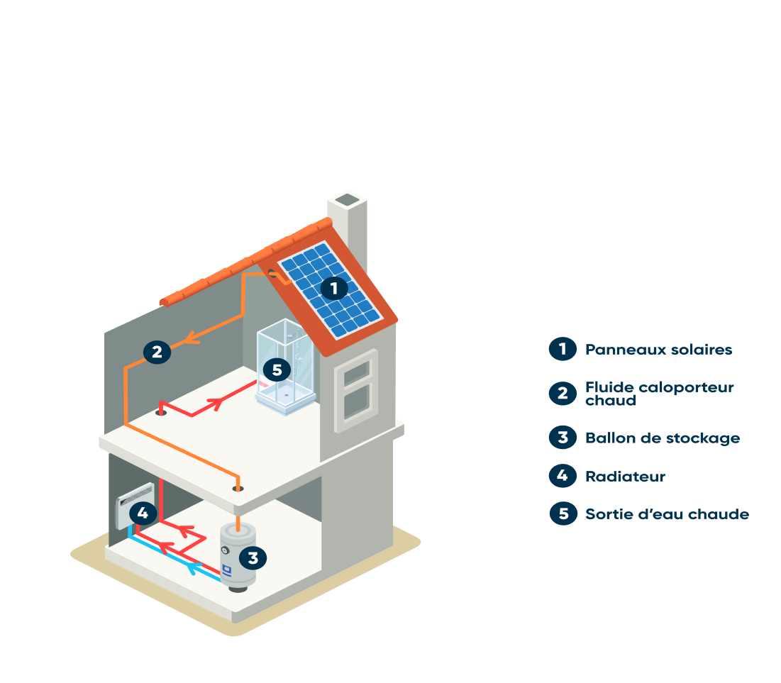 Un Système Solaire Combiné (SSC) utilise l’énergie solaire pour chauffer à la fois l’eau sanitaire et le système de chauffage de votre maison. Les capteurs solaires thermiques, installés sur le toit, captent la chaleur du soleil et la transfèrent à un fluide caloporteur. Ce fluide chauffe l’eau dans un ballon de stockage via un échangeur de chaleur. L’eau chaude est ensuite utilisée pour les radiateurs, les planchers chauffants et les besoins sanitaires.
